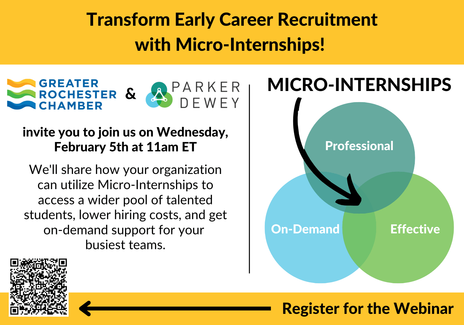 Greater Rochester Chamber's CampusROC program initiative is partnering with Parker Dewey to bring you a virtual workshop on Wednesday, February 5, at 11 a.m., designed to transform and invigorate your early-career recruiting efforts with impactful Micro-Internships!